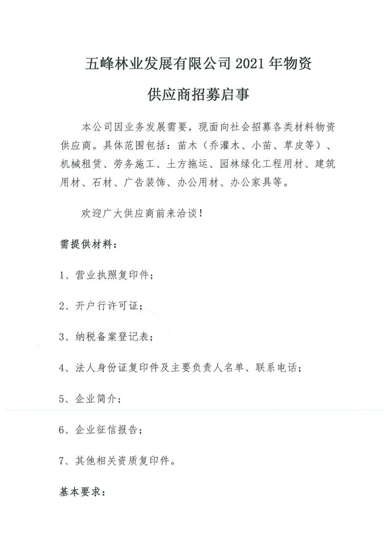 五峰林業(yè)發(fā)展有限公司2021年物資 供應(yīng)商招募啟事