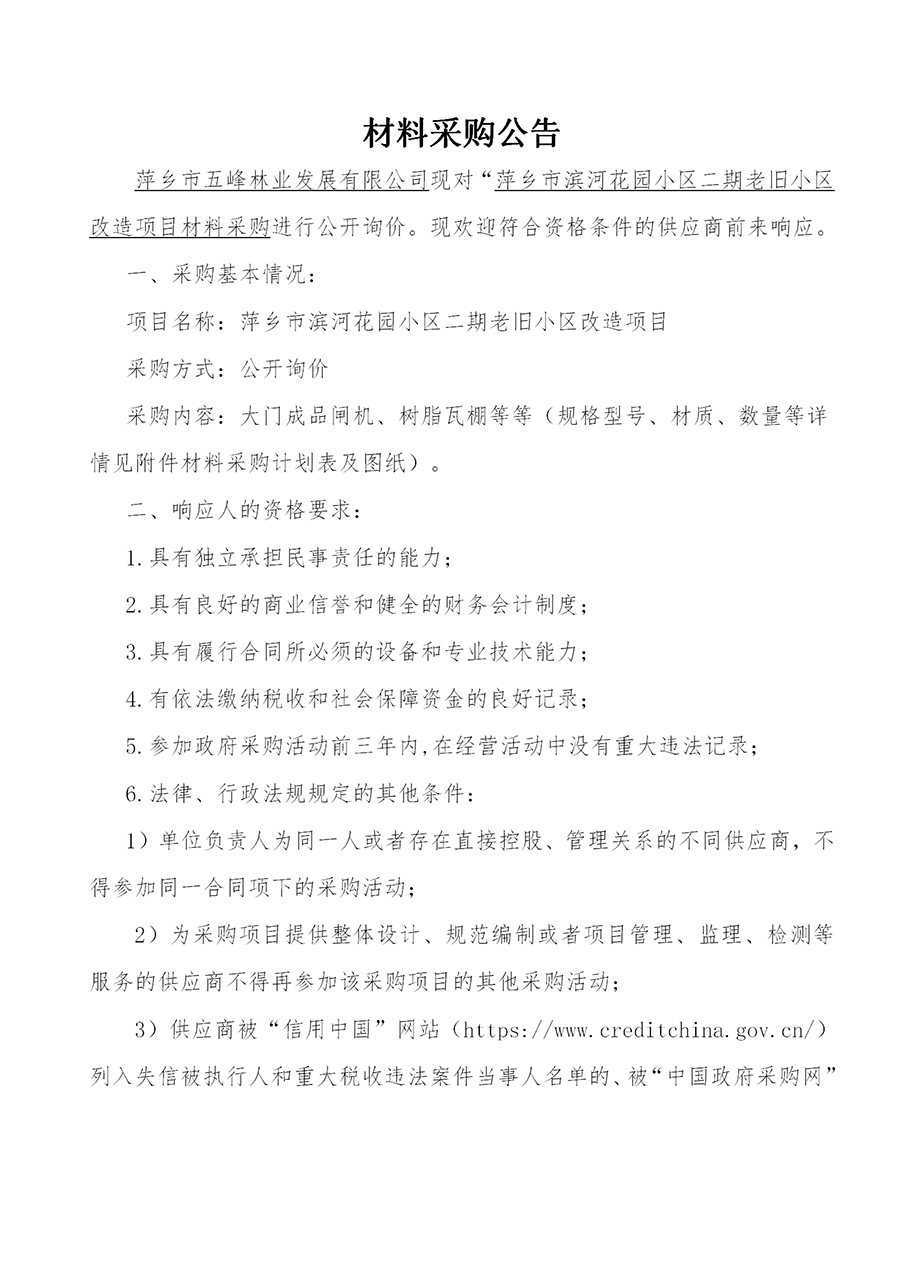 萍鄉(xiāng)市五峰林業(yè)發(fā)展有限公司現(xiàn)對“萍鄉(xiāng)市湘東區(qū)新棚里小區(qū)老舊小區(qū)改造項目材料采購進(jìn)行公開詢價?,F(xiàn)歡迎符合資格條件的供應(yīng)商前來響應(yīng)。