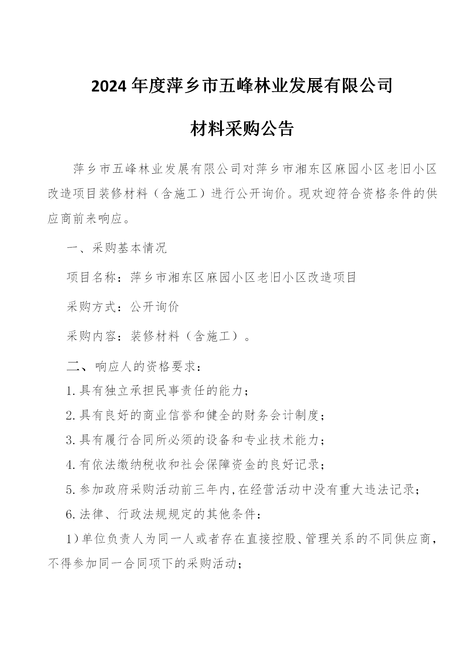 萍鄉(xiāng)市五峰林業(yè)發(fā)展有限公司現(xiàn)對“萍鄉(xiāng)市湘東區(qū)新棚里小區(qū)老舊小區(qū)改造項(xiàng)目材料采購進(jìn)行公開詢價。現(xiàn)歡迎符合資格條件的供應(yīng)商前來響應(yīng)。