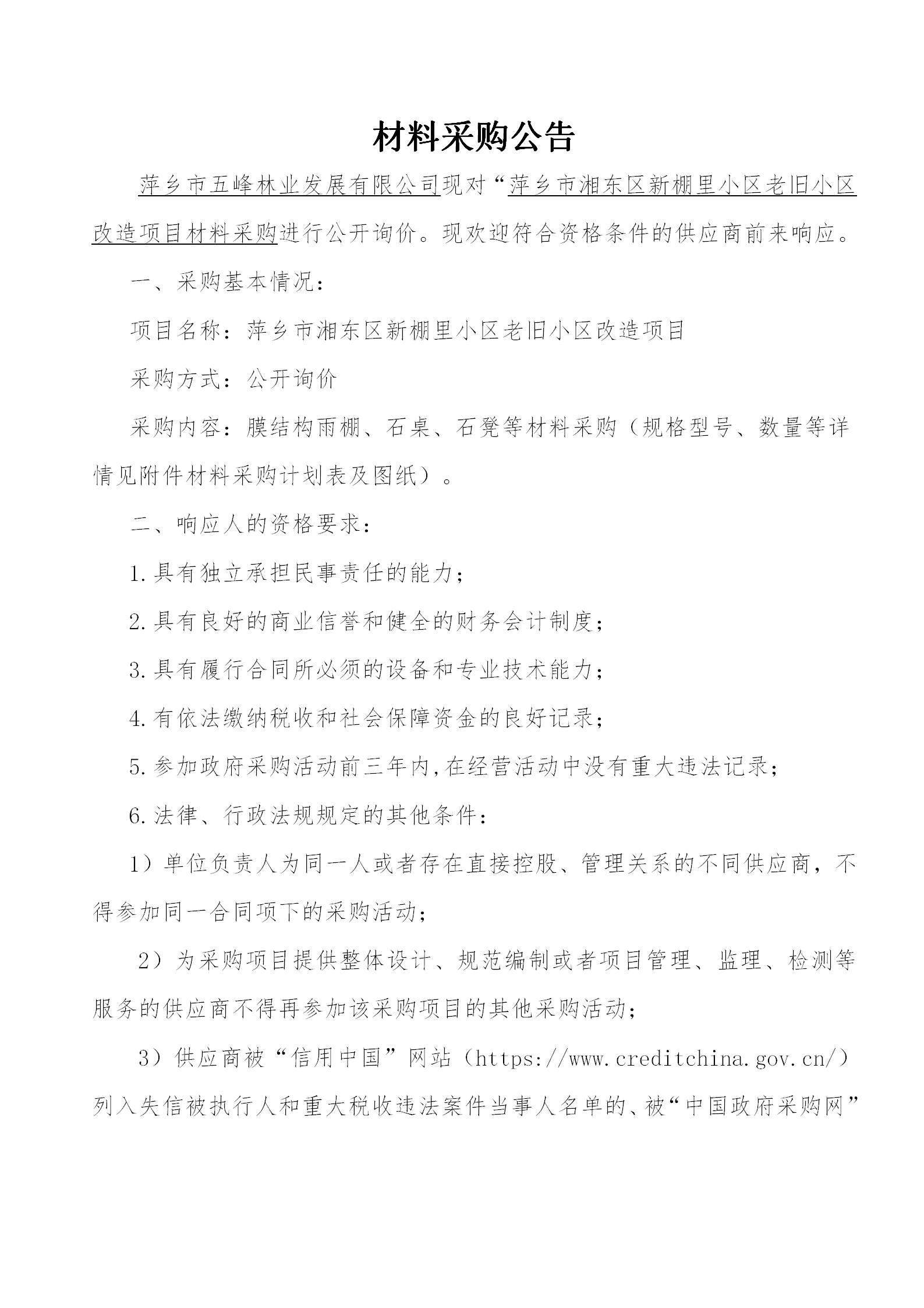 萍鄉(xiāng)市五峰林業(yè)發(fā)展有限公司現(xiàn)對(duì)“萍鄉(xiāng)市湘東區(qū)新棚里小區(qū)老舊小區(qū)改造項(xiàng)目材料采購(gòu)進(jìn)行公開(kāi)詢(xún)價(jià)?,F(xiàn)歡迎符合資格條件的供應(yīng)商前來(lái)響應(yīng)。